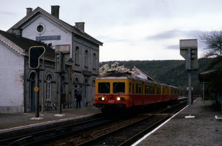 Deze fotogroep bevat twee dia's. Een treinstel bestaande uit twee motorwagens reeks 43 (4307 en 4316) met tussenin twee bijwagens staat aan het perron. Het treinstel is rood en geel geschilderd. We zien het stationsgebouw, de perrons, enkele lichtseinen en een stationsnaambord. Schenking van Myriam Hendrickx.