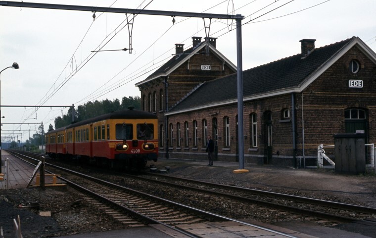BeschrijvingDeze fotogroep bevat twee dia's. Twee gekoppelde motorwagens van de reeks 43 (4308 en 4328) staan voor het stationsgebouw. Op dia 60 verlaat het treinstel het station.