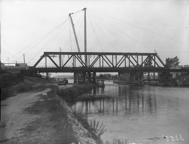 BeschrijvingDe foto toont de aanleg van de brug in vakwerk over het kanaal Bocholt - Herentals. Voor de bouwwerken gebruikt men hijskranen. Het metalen brugdek steunt tijdelijk op brugpijlers in hout.