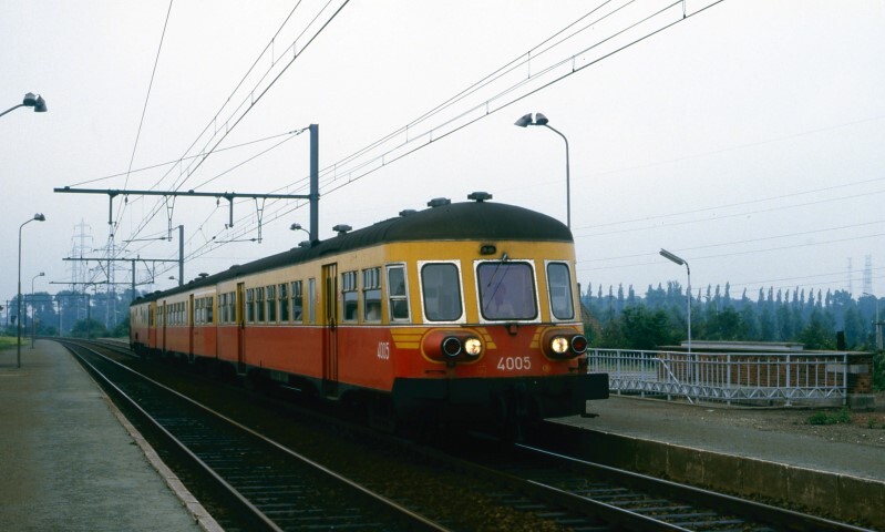 Deze fotogroep bevat drie dia's. Motorwagen 4005 komt aan in het station. We hebben zicht op de perrons en de verlichting. Rechts naast het treinstel bevindt zich de trap naar de onderdoorgang.