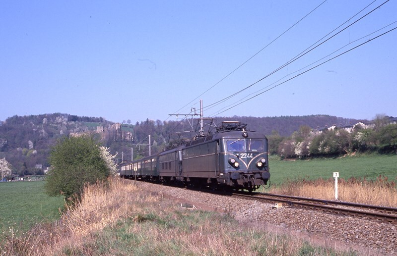 Deze fotogroep bevat vijf dia's. Ze werden genomen ter gelegenheid van een speciale rit van de vereniging TSP-PFT. Elektrische locomotieven 2244 en 2347 slepen samen enkele M 2-rijtuigen op spoorlijn 44 tussen Franchimont en Spa. Schenking van Myriam Hendrickx.