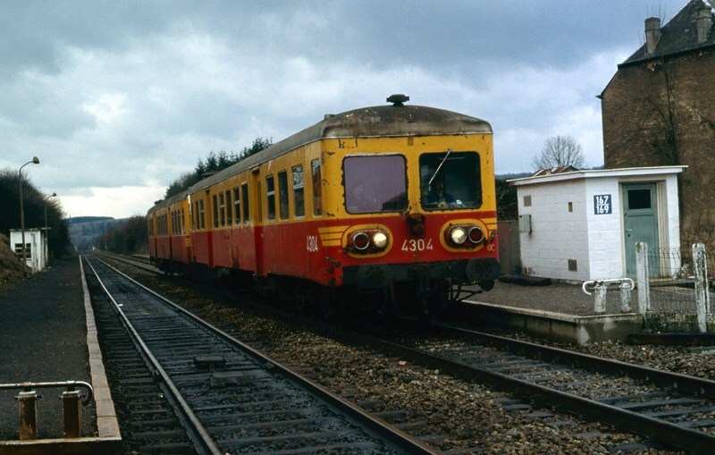 Deze fotogroep bevat twee dia's. Een reizigerstrein met motorwagen 4304 staat aan het perron in de stopplaats Turpange, nabij Messancy. Op het perron links staan verlichtingspalen en een wachthuisje. Rechts staat een technisch lokaal. De stopplaats Turpange ligt langs spoorlijn 167 (Aarlen - Athus - Franse grens). Schenking van Myriam Hendrickx.