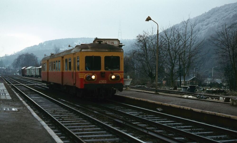 Motorwagen 4303 staat aan het perron in station Lustin. Op de achtergrond staan enkele oude goederenwagens. Station Lustin ligt langs spoorlijn 154 (Namen - Dinant - Franse grens).