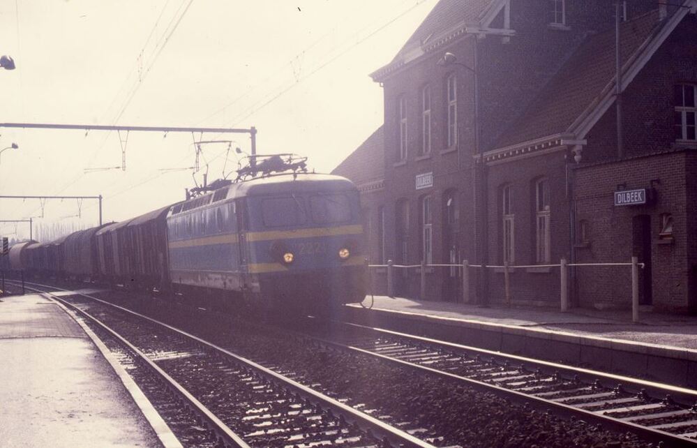 Een goederentrein met gemengde samenstelling, gesleept door elektrische locomotief 2221, rijdt voorbij station Dilbeek. Rechts zien we het stationsgebouw met stationsnaam op het hoofdgebouw en een bijgebouw. Helemaal links op de dia staat een naderingsbaken met vijf strepen dat de afstand aangeeft tot het eerstvolgende waarschuwingssein. Station Dilbeek ligt langs spoorlijn 50 (Gent - Aalst - Brussel). Schenking van Myriam Hendrickx.