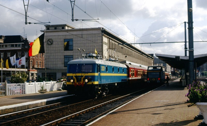 Elektrische locomotief 2221 staat aan het perron in station Hasselt met een inhuldigingstrein naar aanleiding van de elektrificatie van lijn 35 (Leuven – Aarschot – Hasselt). De trein bestaat uit M 4-rijtuigen in bordeaux met een brede witte band. Achteraan zien we elektrische locomotief 2223. Locomotief 2221 is blauw geschilderd met gele zichtbaarheidsstrepen en versierd met de Belgische driekleur. Het perron is gedeeltelijk overdekt met een luifel. Schenking van Myriam Hendrickx.