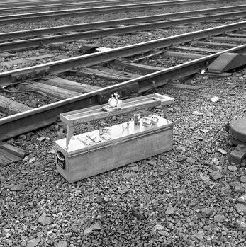 BeschrijvingDe fotogroep bevat acht negatieven. Ze tonen een verplaatsbaar toestel waarmee een rail gecontroleerd kan worden op slijtage.