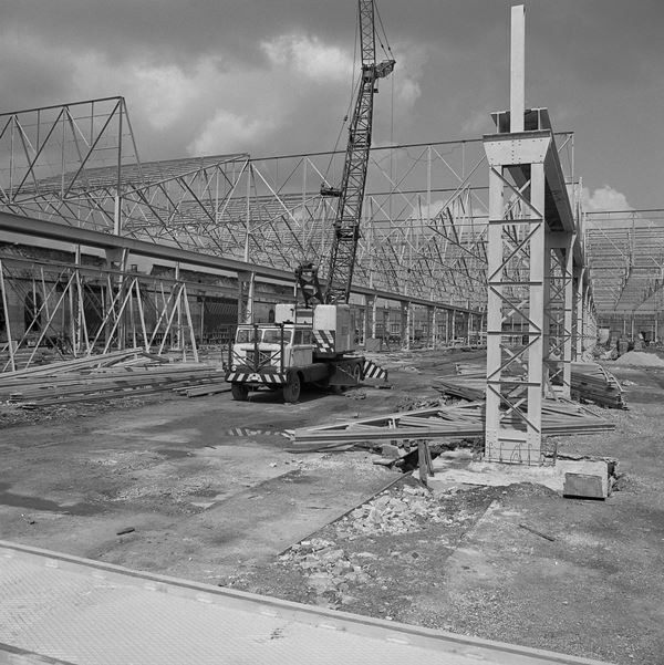 Bouw van een nieuwe hal voor de wagenwerkplaats in Cuesmes