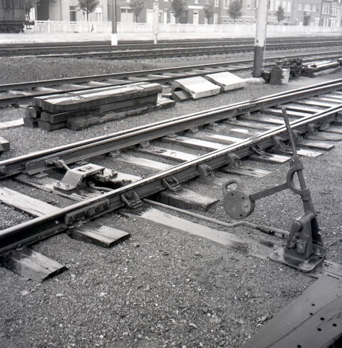 De fotogroep bevat drie negatieven. Op foto's A en B zien we een handbediende wissel, uitgerust met een slot (rechtsonder de handel). Om de wisselstand te veranderen moet het bolvormig contragewicht 180 graden gedraaid worden. Dat kan echter pas na het vrijmaken van het beveiligingsslot. De sleutel van dergelijk slot bevindt zich in de bijhorende telefoonkast (foto C), die naast een diensttelefoon met rechtstreekse verbinding naar het seinhuis ook uitgerust is met een sleutelhouder. De sleutel kan pas uit de sleutelhouder worden genomen na vrijgave door de seingever.