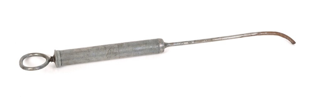 BeschrijvingDeze cillindervormige smeerkan uit koper en metaal heeft een reservoir, een dunner lopende spuit en een beweegbare hendel.