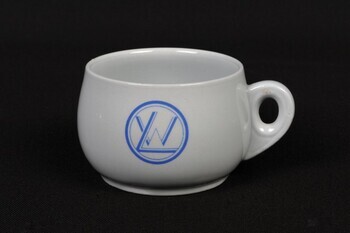 BeschrijvingAfgeronde koffiekop met een klein oor. Op een zijde staat een blauw monogram WL van de Wagons-Lits.