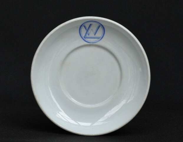 Klein lichtgrijs bordje met in de rand een blauw monogram WL van de Wagons-Lits, bedoeld om een kopje op te zetten.
