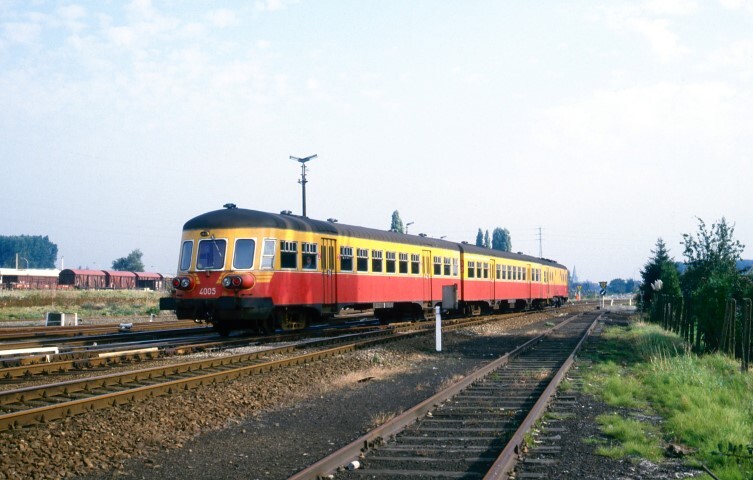 Motorwagen 4005 rijdt over een wisselstraat van de uitrijbundel van het station. Tussen de sporen staat een paal met een diensttelefoon. Links op de achtergrond zien we enkele goederenwagens.