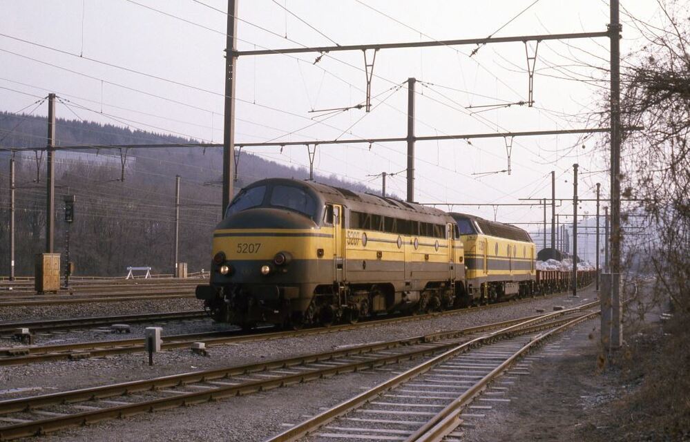 Goederentrein met diesellocomotieven 5207 en 5502 in Jemelle