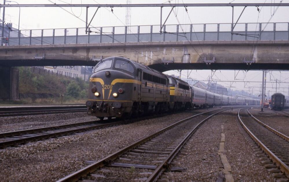 Deze fotogroep bevat twee dia's. Een "Lourdestrein" wordt in dubbeltractie gesleept door de locomotieven 5208 en 5214. De trein vertrekt juist uit station Libramont. Dit station ligt op de kruising van spoorlijn 162 (Namen - Luxemburgse grens) met de lijnen 163 (Libramont - Sankt Vith) en 163A (Bertrix - Franse grens). Schenking van Myriam Hendrickx.