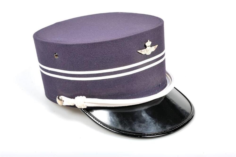 Donkerblauwe kepie met een klep in kunststof, langs de buitenkant zwart en onderaan groen. Boven de klep is een dubbele witte koord, bevestigd met twee ronde metalen knopen. Er lopen twee witte biezen, op 4 en 5 cm van de rand. Vooraan is een zilverkleurig spoorweginsigne bevestigd. De kepie is verstevigd met een zwart leren band en de voering is bruin. Hij werd in verschillende maten bewaard.