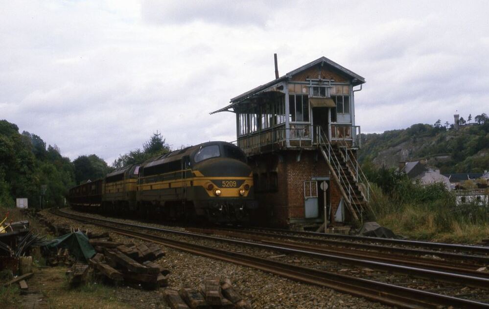 Een ertstrein wordt gesleept door diesellocomotieven 5208 en 5309 in dubbeltractie. De trein rijdt voorbij een buiten dienst gestelde seinpost in Neffe. Naast de sporen liggen een aantal houten dwarsliggers.
