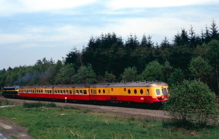 Motorwagen 4006 wordt op sleeptouw genomen door diesellocomotief 5210. Het treinstel is rood en geel geschilderd. De trein rijdt in een bosrijke omgeving op een dubbelsporig traject. Ter hoogte van de motorwagen is een betonnen kilometerpaal te zien. Schenking van Myriam Hendrickx.