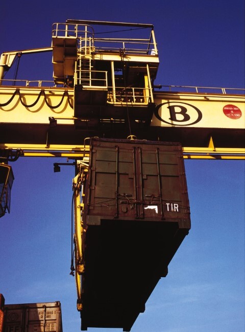 BeschrijvingDe foto toont een portaalkraan die een container verplaatst. Op het portaal staat het logo van de NMBS en het opschrift 'Verboden onder de last te komen'.