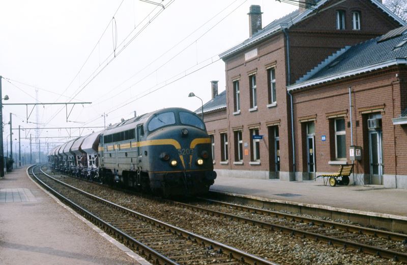 Een goederentrein met diesellocomotief 5203 rijdt voorbij station Amay. De sleep bestaat uit gesloten kalkwagens. De stationsnaam is aangebracht op de achterzijde van het stationsgebouw. Op het perron zien we een handkar die gebruikt werd om bagage van en naar de treinen te brengen. Dit station ligt langs spoorlijn 125 (Luik-Guillemins - Namen). Schenking van Myriam Hendrickx.