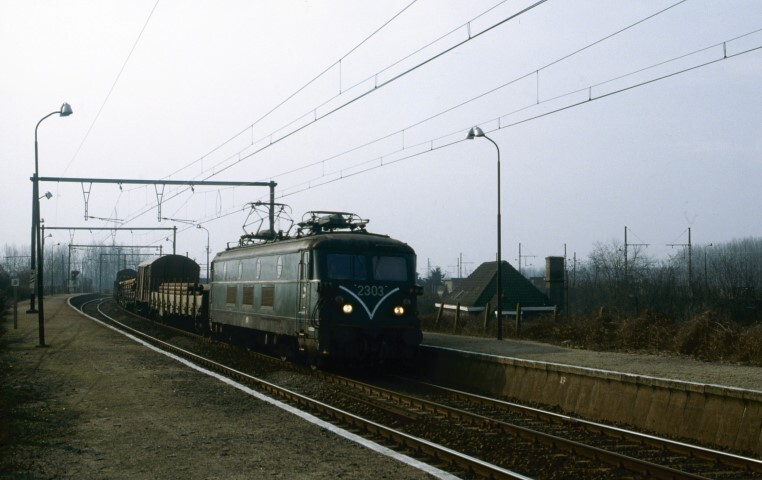 Deze fotogroep bevat twee dia's. Ze tonen twee locomotieven reeks 23. Op de eerste foto sleept locomotief 2303 een gemengde goederentrein langs het perron. De locomotief heeft nog haar donkergroene livrei. De tweede foto toont elektrische locomotief 2307 met een platte wagen aan de haak. Deze locomotief is lichtblauw geschilderd met gele zichtbaarheidsstrepen. Schenking van Myriam Hendrickx.