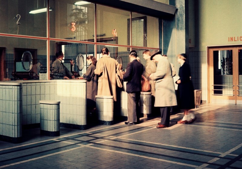 Deze fotogroep bestaat uit twaalf negatieven. De meeste foto's tonen de ruime inkomhal van het station met wachtende reizigers, een krantenkiosk, een weegschaal en een bar. Aan de loketten schuiven reizigers aan om een vervoerbewijs te kopen. Tegen de muren hangen spoorwegaffiches. Op enkele foto's zien we het interieur van het buffet met toonbank, tafels, stoelen, klanten en personeel.