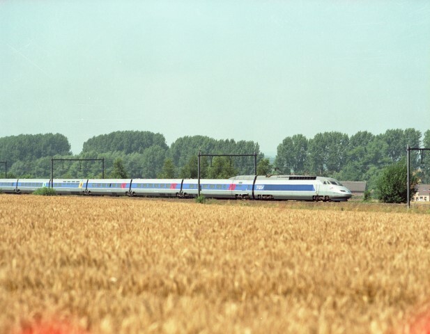 Deze fotogroep bevat twee negatieven. Ze tonen een hogesnelheidstrein samengesteld uit Franse SNCF-motorstellen van het type TGV-Atlantique. De foto's werden genomen in de bocht aan de uitrit van het station Aat.