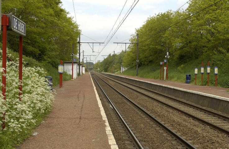 De groep bevat 29 digitale foto's. De halte De Hoek ligt onder straatniveau. De perrons kunnen bereikt worden door twee trappen. Op de perrons staan betonnen schuilhuisjes, stationsnaamborden en palen met dienstregelingsaffiches. Reizigers wachten op het perron, verschillende treinen rijden voorbij. De laatste foto's tonen spoorlijn 124 (Brussel - Charleroi) in de buurt van het station.