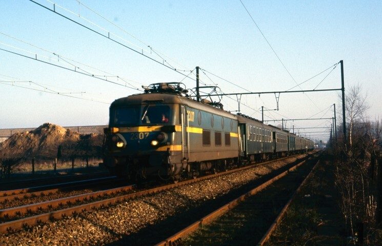 BeschrijvingElektrische locomotief 2307 sleept een reizigerstrein samengesteld uit I 2-rijtuigen.