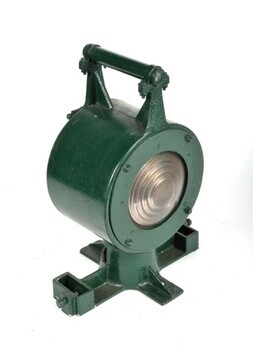 BeschrijvingDeze groene elektrische lamp werd aan een seinpaal bevestigd voor het geven van nachtseinen. Door het buisje bovenaan kon de lamp goed gericht worden. Op verschillende plaatsen is het NMBS-logo aangebracht.