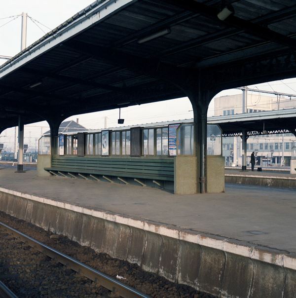 Deze fotogroep bestaat uit twee negatieven. Ze tonen twee perrons die met een luifel zijn uitgerust. Op een van de perrons zien we een zitbank met reclameaffiches en een handkar voor het vervoer van stukgoed en postzakken.