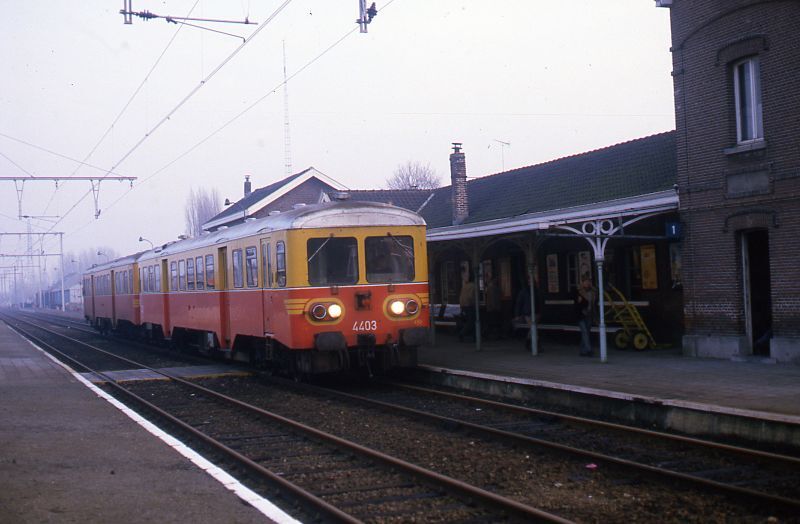De fotogroep bevat twee dia's. Een reizigerstrein, samengesteld uit motorwagens 4403 en 4409, staat aan het perron in het station Puurs. Op het perron, dat gedeeltelijk overdekt is met een luifel, staat een handkar voor het vervoer van pakjes en bagage. Dit station ligt langs spoorlijn 52 (Antwerpen-Zuid - Dendermonde). Schenking van Myriam Hendrickx.