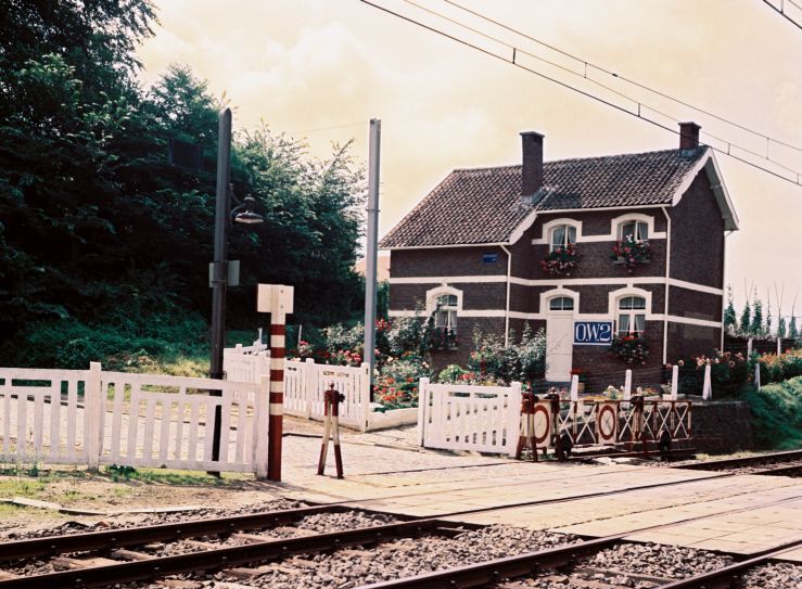 Deze fotogroep bevat twee negatieven. Overweg 2 is uitgerust met rolbarelen. Ernaast staat het huis van de overwegwachter. Het nummer van de overweg hangt naast de voordeur. Aan de andere zijde is een klein schuilhuisje, waar de overwegwachter poseert naast het wiel waarmee de rolbareel werd bediend. We krijgen een zicht op de mooi onderhouden tuin. Een afsluiting samengesteld uit witte betonnen elementen bakent het spoorwegdomein af.