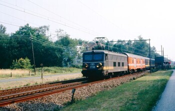 BeschrijvingElektrische locomotief 2558 (reeks 25.5) sleept een Beneluxtrein. De trein heeft een ongewone samenstelling: achter de locomotief bevindt zich een Dms-pakwagen.