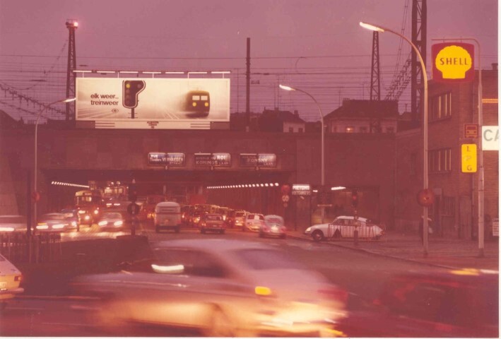 De foto toont een spoorwegaffiche met als opschrift 'elk weer... treinweer' en het logo van de NMBS. Naast het opschrift staat een lichtsein op groen. Rechts sleept een elektrische locomotief een trein doorheen een dikke mistbank. De affiche hangt aan een spoorwegviaduct in de buurt van station Brussel-Zuid.