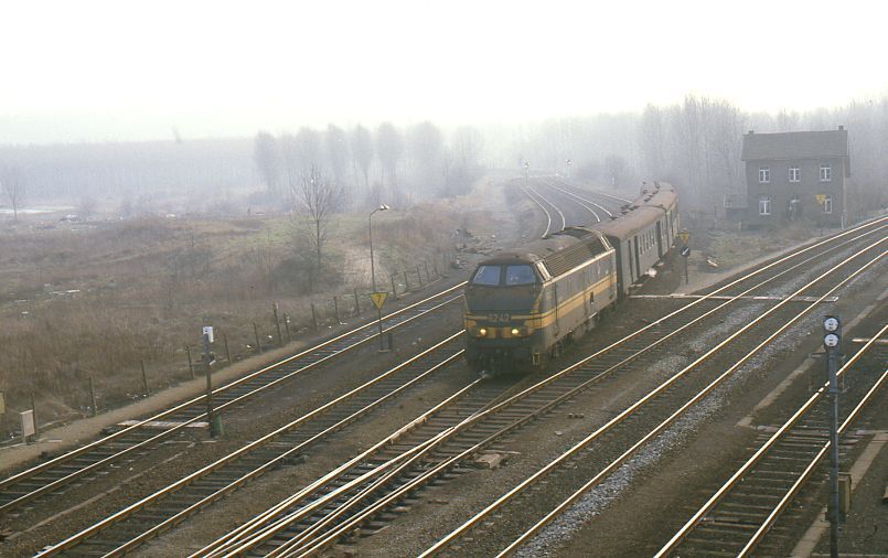 Diesellocomotief 6242 sleept een reizigerstrein die is samengesteld uit M 1-rijtuigen. De locomotief is groen geschilder met gele zichtbaarheidsstrepen. Het konvooi rijdt ter hoogte van de splitsing van de spoorlijnen 90 en 123. Er zijn enkele lichtseinen en snelheidsverminderingsborden te zien. Deze laatste leggen de bestuurders een snelheidsbeperking van 70 km/u op. Op de achtergrond staat een baanwachterswoning. Schenking van Myriam Hendrickx.