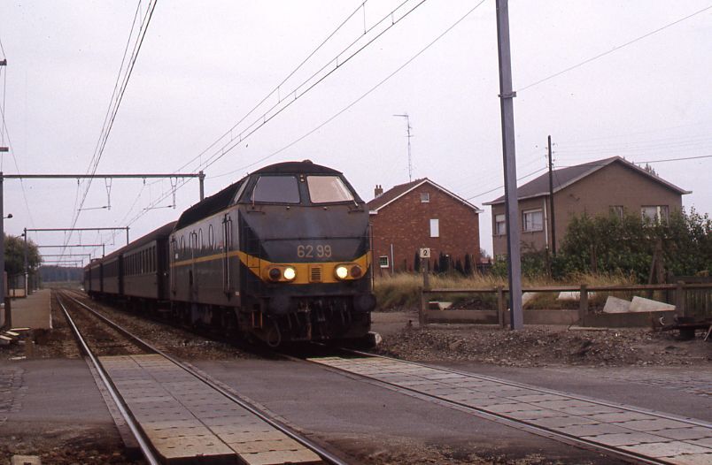Diesellocomotief 6299 verlaat het station Baasrode-Zuid met een reizigerstrein samengesteld uit K-rijtuigen. Links op het perron zien we verlichting en een wachthuisje. Op de voorgrond is een overweg. Station Baasrode-Zuid ligt langs spoorlijn 52 (Antwerpen-Zuid - Puurs - Dendermonde). Schenking van Myriam Hendrickx.