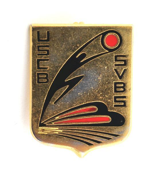 De gestileerde afbeelding in zwart en oranje toont een man die een bal vasthoudt boven het hoofd. Onderaan zien we een trein en sporen. Aan de zijkanten van de afbeelding staat 'USCB' en 'SVBS'. De afkortingen staan voor 'Union sportive des cheminots belges' en 'Sportverbond van Belgische Spoorwegarbeiders'.