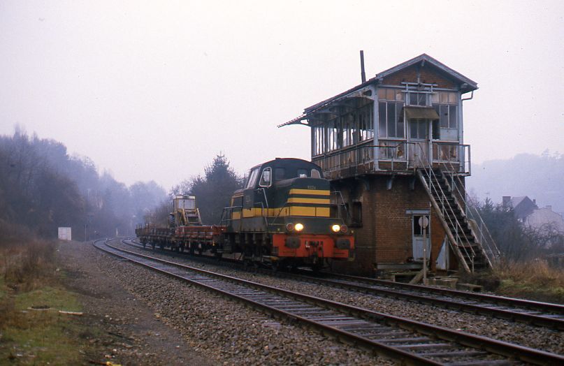 BeschrijvingRangeerlocomotief 9224 rijdt met een werktrein voorbij een voormalige seinpost in Neffe.