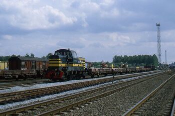 BeschrijvingRangeerlocomotief 9203 rijdt met een gemengde goederentrein aan de haak in de sporenbundel te Lessen. Op de achtergrond staan nog gesloten en platte goederenwagens.