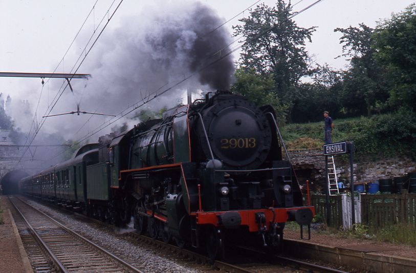 Deze fotogroep bevat zeven dia's. Stoomlocomotief 29.013 (type 29 - 1D Consolidation) staat met een reizigerstrein samengesteld uit L-rijtuigen aan het perron. De volgende foto toont de achterkant van de trein met diesellocomotief 5503. Schenking van Myriam Hendrickx.