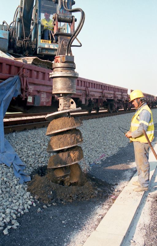 De fotogroep bevat 9 negatieven. Ze tonen hoe door middel van een kraan een put langsheen het spoor geboord wordt. In een latere fase zal in de put beton gegoten worden als fundering van een bovenleidingspaal. Op foto C zien we diesellocomotief 7625 behorende tot reeks 76 (ex-NS). Zij verzekert de trekkracht voor de werktrein.