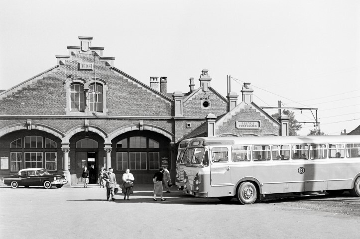Deze fotogroep bestaat uit drie negatieven. Ze tonen de voorgevel van het station uit 1884. De puntgevels zijn met stenen ornamenten bekroond. Een korte galerij met drie arduinen bogen, gedragen door arduinen zuilen, schermt de ingang af. Reizigers stappen over op vervangingsautobussen van de NMBS.