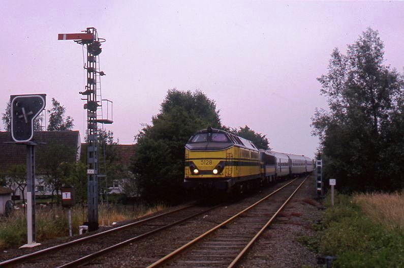 Deze fotogroep bevat twee dia's. Diesellocomotief 5128 sleept een elektrische locomotief met een Lourdestrein aan de haak. De trein rijdt voorbij een mechanisch sein in Zingem. Het lichtsein dat het mechanisch sein zal vervangen is nog niet in dienst, dit is te zien aan het witte kruis. Schenking van Myriam Hendrickx.