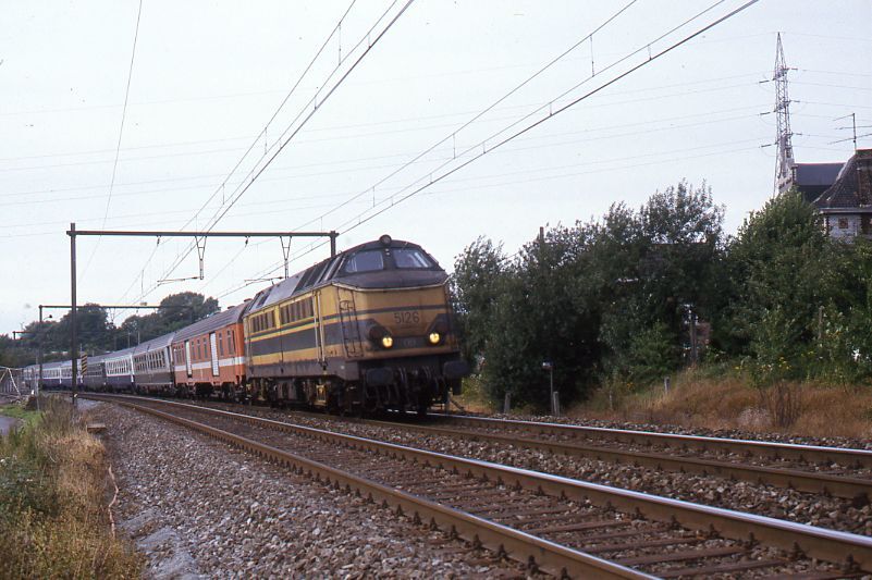 Deze fotogroep bevat twee dia's. Diesellocomotief 5126 sleept een internationale trein. Het gaat hier om een bedevaarttrein naar Lourdes. Het tweede rijtuig is een ambulancerijtuig van de Franse spoorwegen (SNCF).