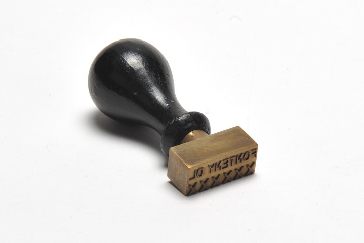 TitelMetalen stempel 'Fonteny DL X X X X X X' met houten handvat