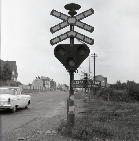 De fotogroep bevat zes negatieven. Foto's B, C, D en F tonen de wegsignalisatie van de overweg, met knipperlichten en het Andreaskruis. Foto E toont de schakelkast waarmee de overwegsignalisatie bediend werd. Op foto A zien we een stopbord langs de sporen.