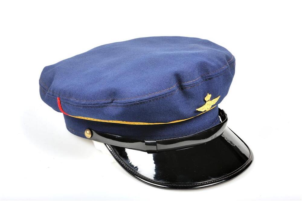 Donkerblauwe dienstpet met een zwarte klep in kunststof. De stormband is van kunststof en vastgemaakt met ronde metalen knopen. Er loopt een gele bies op 2,5 cm boven de rand en een enkele rode verticale streep aan beide zijkanten. Vooraan is een spoorweginsigne bevestigd. De platte pet is verstevigd met een leren band en de zomervoering is blauw of donkergrijs.