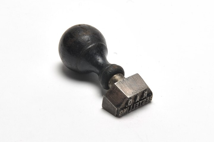 TitelMetalen stempel 'R.A.D. Bestelling' met houten handvat