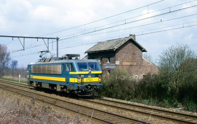 Deze fotogroep bevat drie dia's. Elektrische locomotief 2760 houdt even halt voor een vervallen baanwachterswoning. Locomotief 2755 sleept een reizigerstrein samengesteld uit M 4-rijtuigen.