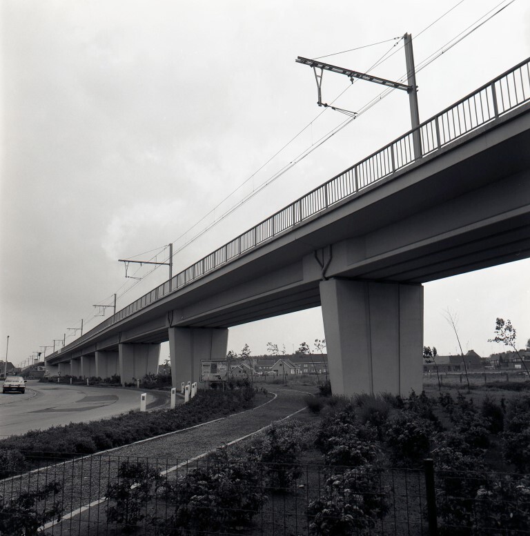Deze fotogroep bestaat uit zeven negatieven. Ze tonen het spoorwegviaduct ter hoogte van de Boudewijnlaan. Op foto B wordt de ballast van de spoorlijn Lokeren - Dendermonde met behulp van twee Matisa-machines onder de dwarsliggers gestopt en genivelleerd.
